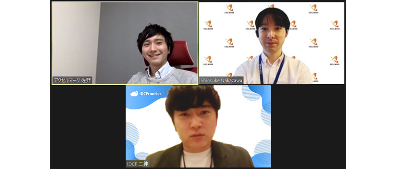 今回は、アクセルマーク社広告事業システム責任者の佐野ゼネラルマネージャーとインフラ管理を担当している中沢伸介ゼネラルマネージャー、IDCフロンティア営業の二神(ふたがみ)が、クラウド移行や、デジタルインフラを利用する側と提供する側の関係について座談会方式で意見を交わしました。