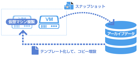 万一の場合にもスナップショット保存時点と同様の仮想マシンを新規作成できるため、早期復旧に役立ちます。