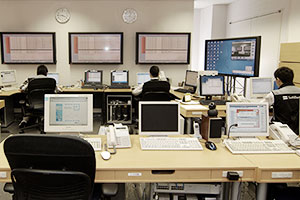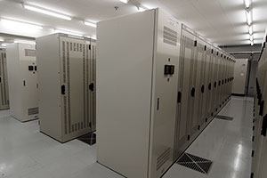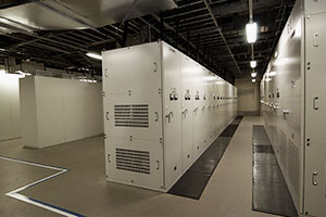 Power is supplied to the building by highly reliable "3-spot network feeding." On each floor, power is supplied to each rack through a UPS with a capacity of 1,000 KVA. As emergency power supply, the building is equipped with a gas turbine generator that can be operated continuously for 18 hours using an emergency switching battery and stored fuel.