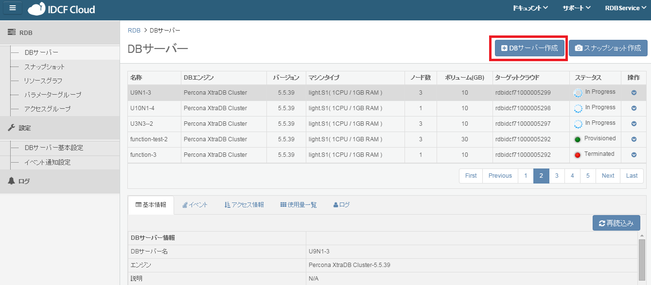 4. RDB管理画面の右上にある「DBサーバー作成」からDBサーバーの作成ができます。