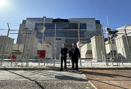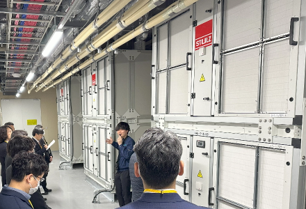 まずは、データセンターの安定稼働を支える電気・空調設備のフロアからスタートし、電力供給会社から66,000Vの特別高圧で受電する巨大な変圧器を前にして、参加者の方々は普段見たことのない設備に興味津々です。
