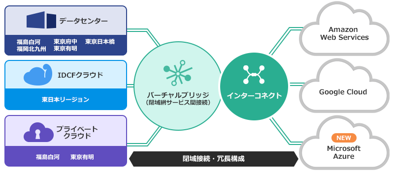 「バーチャルブリッジ(インターコネクト:メガクラウド)」は、IDCフロンティアのデータセンターやクラウドなどのサービス間を閉域網で接続する「バーチャルブリッジ」のオプションサービスです。従来の接続先である Amazon Web Services、Google Cloud に加え、新たにMicrosoft Azure が接続先として加わります。