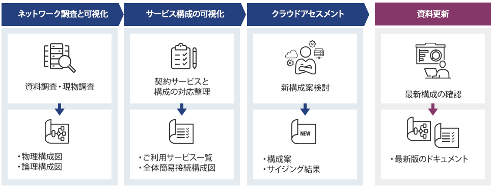 ITインフラ調査・アセスメントサービスは、お客さまのITインフラを調査することで現状を可視化し、最適なITインフラへ向けた課題解決を支援するサービスです。お客さまは、システムの構成把握、サイジングによる余剰リソース状況等、改善に向けた情報をまとまった資料として得ることができます。
