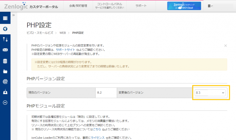 利用するPHPのバージョン(7.4/8.1/8.2/8.3)を、カスタマーポータルでお選びいただけます。