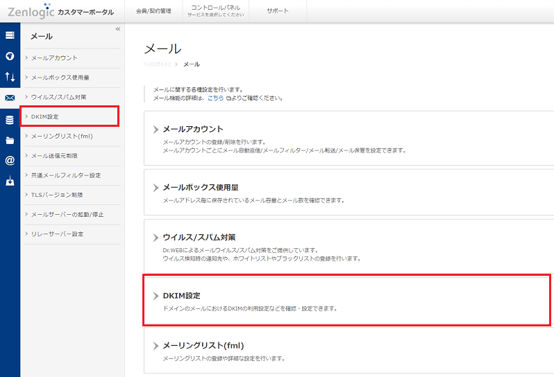 Zenlogicカスタマーポータル(コントロールパネル)の「DKIM設定」画面より、DKIM署名鍵の設定等が可能です。