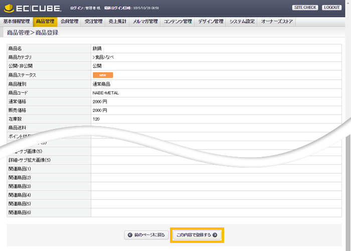 EC-CUBEの管理画面にログインし、「商品管理」→「商品登録」メニューをクリックします。