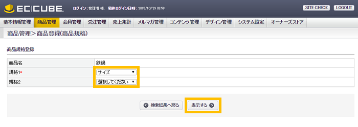 登録した商品で利用する規格を選択し、「表示する」ボタンをクリックします。