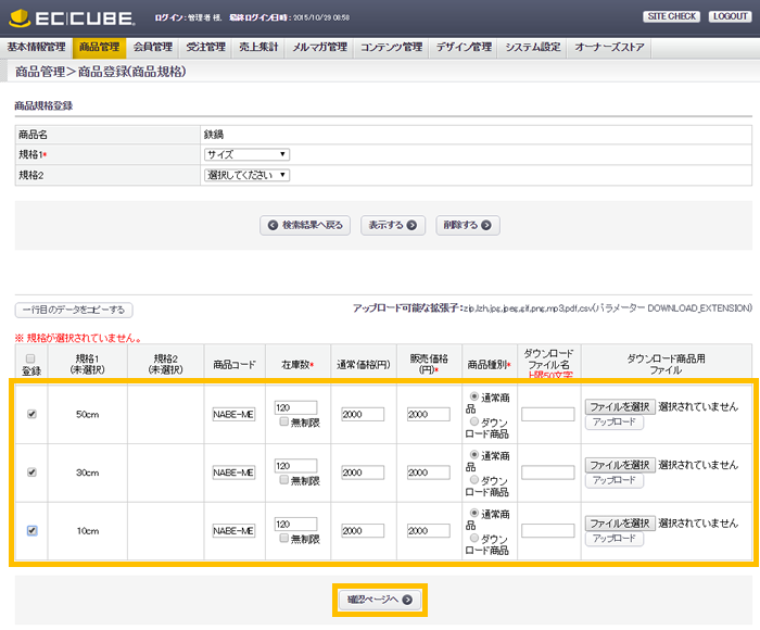 規格情報の設定が完了したら「確認ページヘ」ボタンをクリックします。
