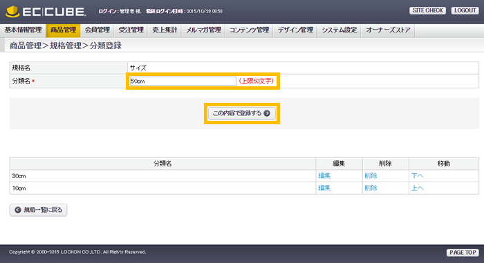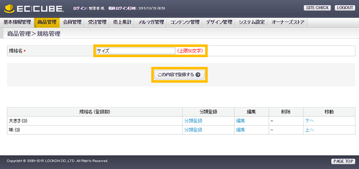 新しく登録する場合は、テキストボックスに規格名を入力し、「この内容で登録する」ボタンをクリックします。