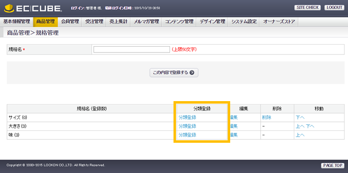 EC-CUBEの管理画面にログインし、「商品管理」→「規格管理」メニューをクリックします。