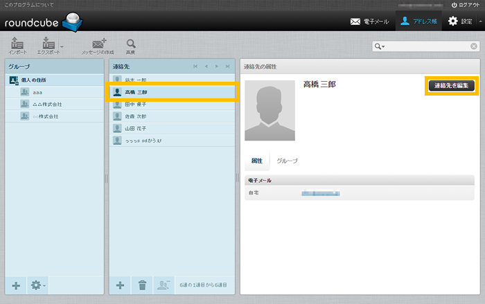 ※ Roundcubeで削除した連絡先は復元できません。設定には十分ご注意ください。