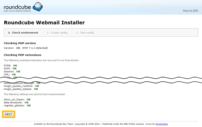 サーバーやデータベースの準備が正しく行われていれば、「Check environment」画面でSQLiteに関する記述を除き「OK」が表示されます。