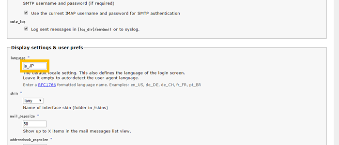 「Dislpay settings & user prefs」のセクションで、「language」の項目に「ja_JP」を入力します。
