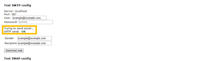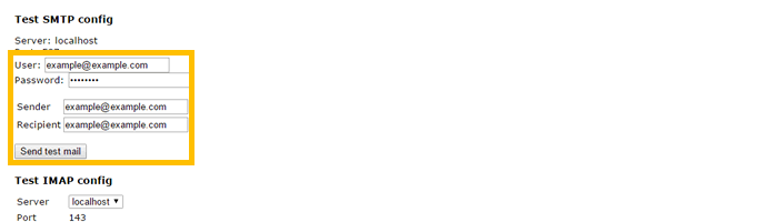 送信テストに必要なメールアドレスの情報を入力し、「Send test mail」ボタンをクリックします。