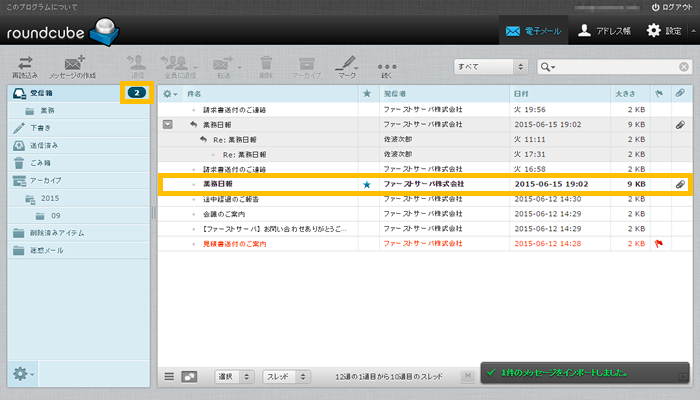 インポートが正常に完了したら、受信箱に「未読」の状態でインポートしたメールが表示されます。