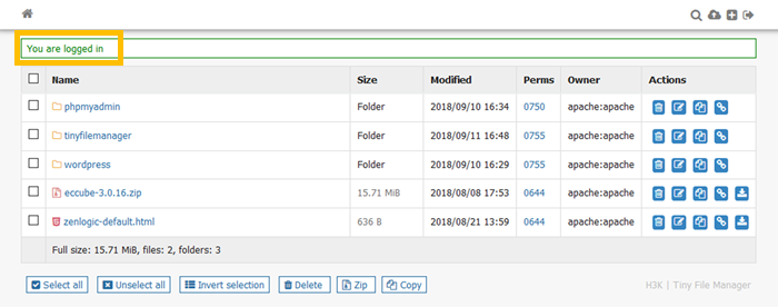 ログインが正常に行われると、Tiny File Managerの画面が表示されます。