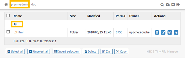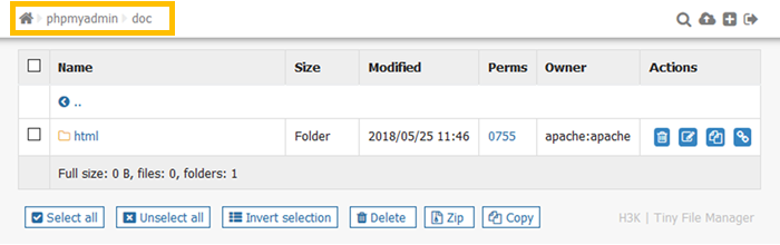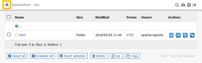 Tiny File Managerのトップ画面に表示される項目やボタンについてご案内します。