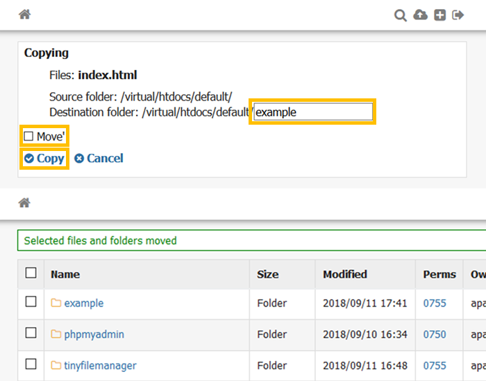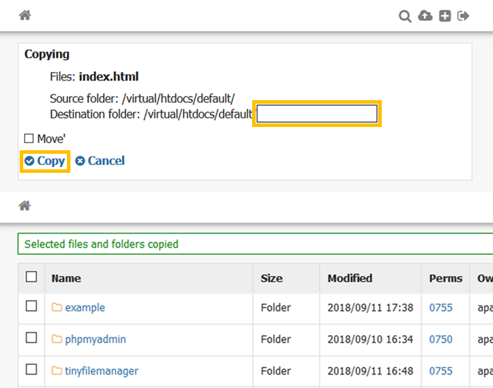 「Copying」の画面が表示されたら、「Destination folder」に選択したデータをコピーを作成したいディレクトリまでのパスを入力して、Move' にチェックを入れてCopyボタンをクリックします。