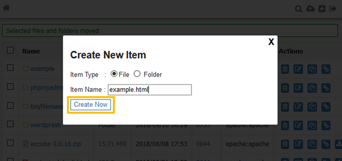 Tiny File Managerで表示されている場所にファイルを作成します。 ファイルを作成したい場所が下層ディレクトリ内の場合は、該当ディレクトリまで移動します。