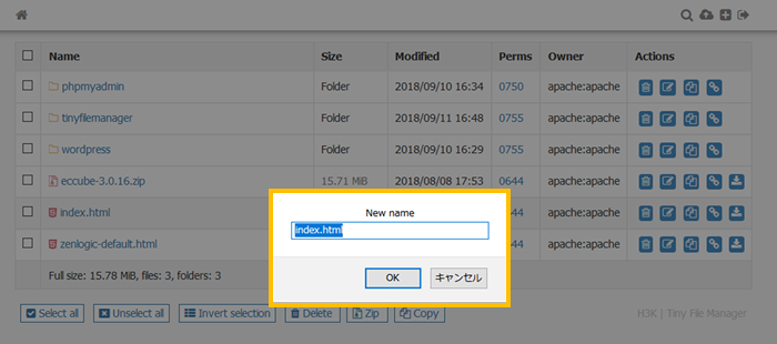 ※ 名前の変更はファイル/ディレクトリの両方で可能です。