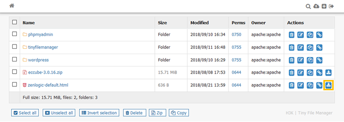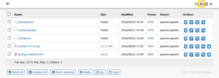 なお、Tiny File Managerでは、ファイルが含まれているディレクトリをまるごとアップロード/ダウンロードすることはできません。ディレクトリを圧縮するか、FTPソフトをご利用ください。