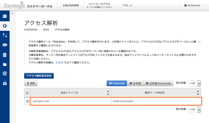 解析結果を確認したいドメイン名の「解析データ保存先」のディレクトリを確認します。