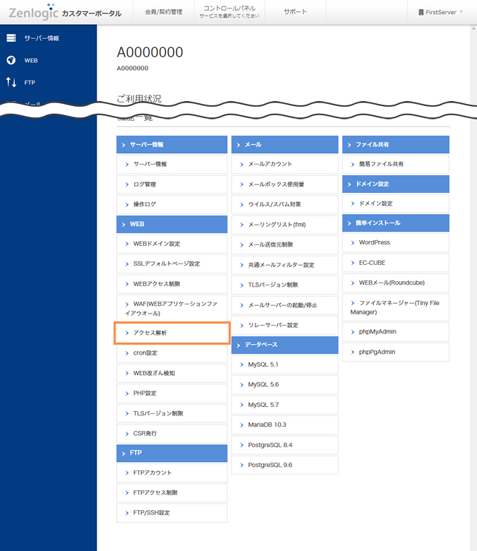 Zenlogicカスタマーポータルにログインし、「コントロールパネル」メニューから対象のサービスを選択します。
