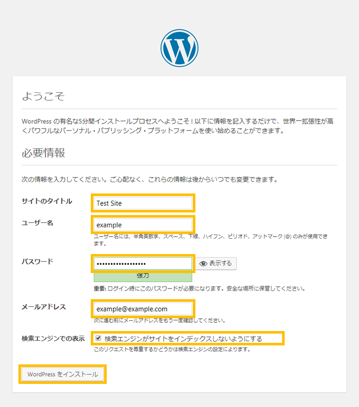 以下の各項目を設定し、「WordPressをインストール」ボタンをクリックします。