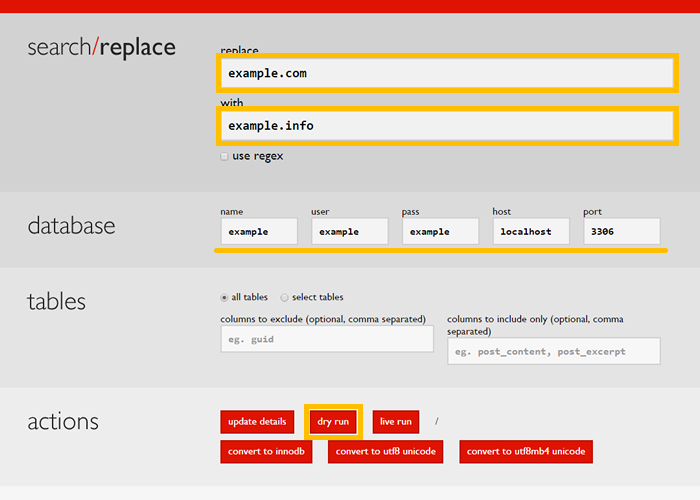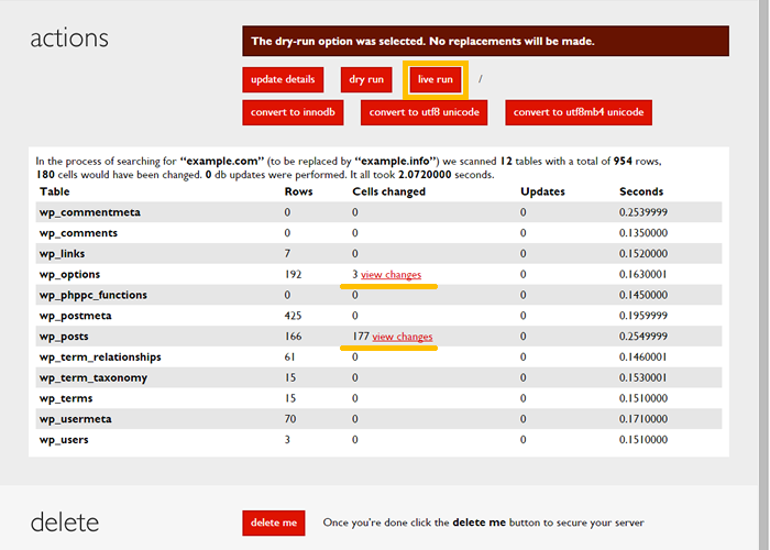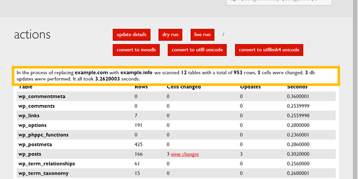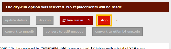 「dry run」の実行後、「Cells changed」の項目に「0」以外の数値が入っていれば、データベースに変更前の文字列が存在します。