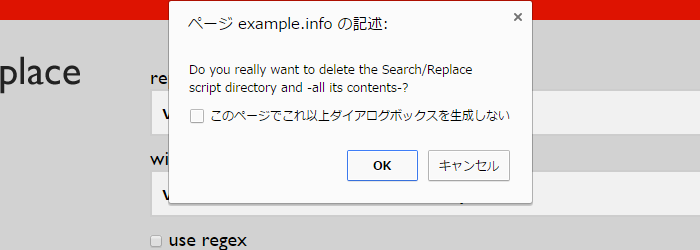 ツールの下部に表示されている「delete me」ボタンをクリックすると確認メッセージが表示されますので、削除して問題なければ「OK」ボタンをクリックします。