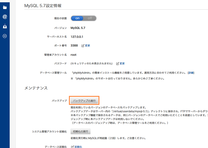 ※本バックアップ機能で取得したデータを、データベースのバージョンアップなどに利用すると破損する可能性があります。データベースのバージョンアップ時などは、データベース管理ツール(phpMyAdmin等)をご利用ください。※破損したデータベースを弊社にて修復することはできません。あらかじめご注意ください。