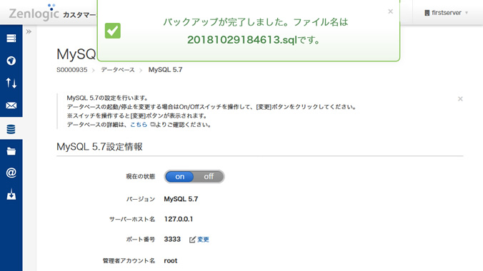 | MySQL 5.7の場合 | 出力先ディレクトリ | /virtual/userdata/mysql-5.7/ |