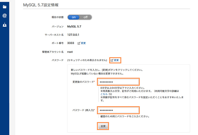 ご利用になるデータベースの設定画面にアクセスし、「パスワード」の「変更」リンクをクリックします。