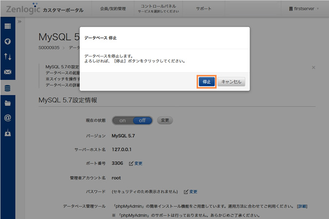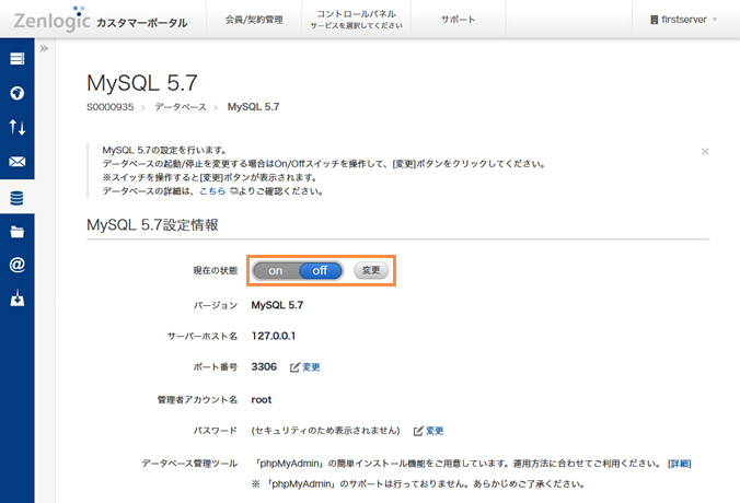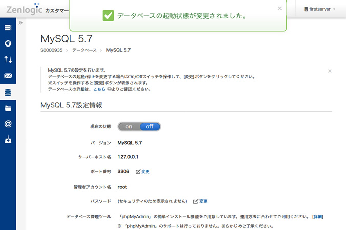 データベースの管理者パスワードはコントロールパネルからいつでもご変更いただけます。