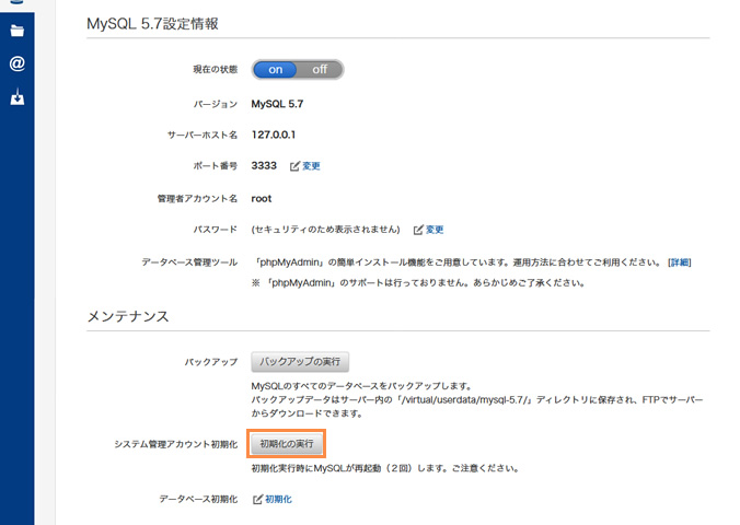 「システム管理アカウント初期化」の「初期化の実行」ボタンをクリックします。