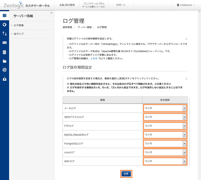 各ログの保存期間を設定し、「変更」ボタンをクリックします。