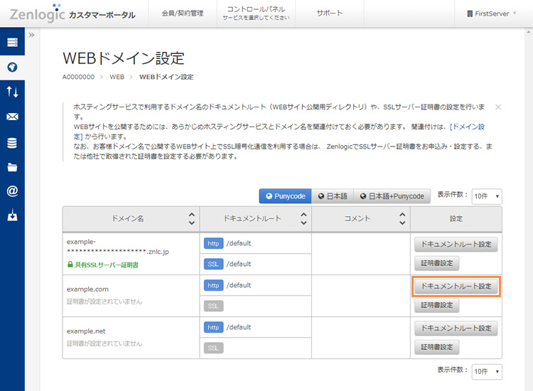 現在サーバーに設定されているドメイン名が一覧で表示されますので、設定対象ドメイン名の「ドキュメントルート設定」ボタンをクリックします。