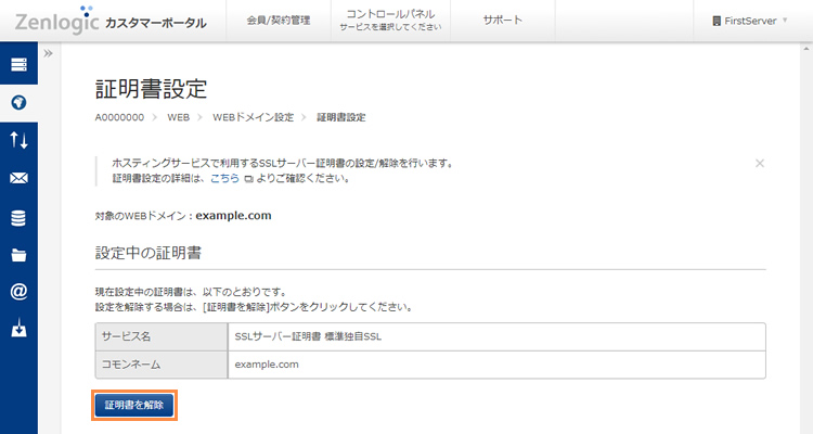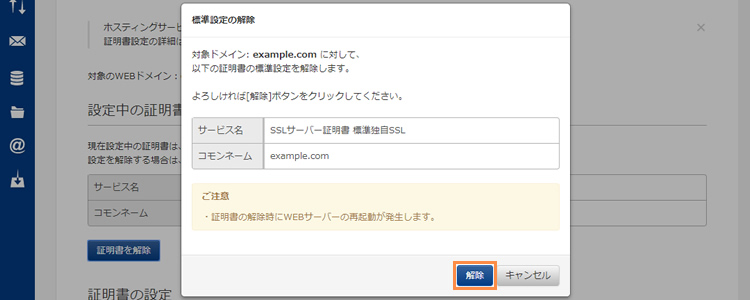 ドメイン名に対するSSLサーバー証明書の設定を解除したい場合は、以下の手順で設定を行います。