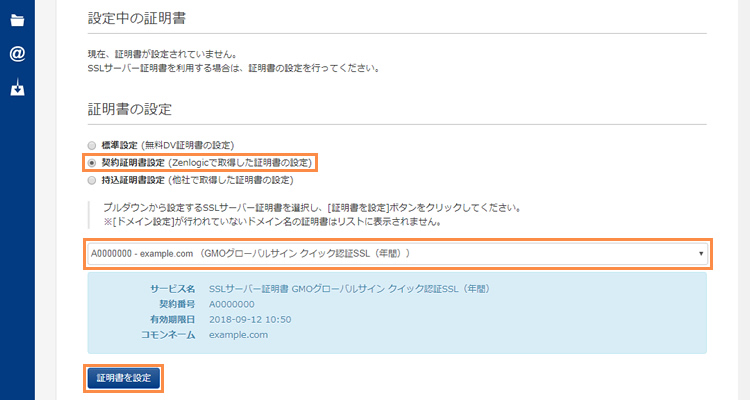 「証明書の設定」欄の「契約証明書設定(Zenogicで取得した証明書の設定)」を選択します。
