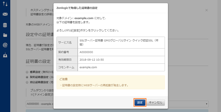 ※ 証明書の設定時にWEBサーバーの再起動が発生します。