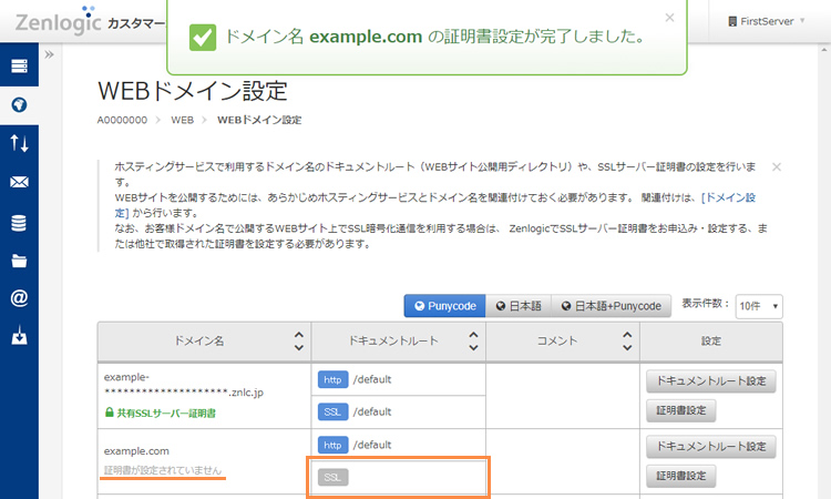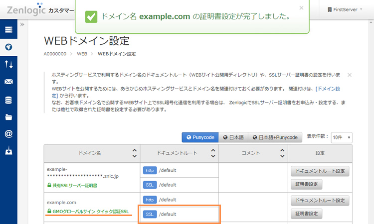 ※ 該当ドメイン名の項目に契約証明書の名称が表示され、ドキュメントルートのSSLの項目が設定されます。