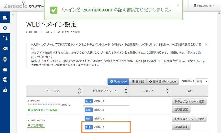 ※ 該当ドメイン名の項目に「持込証明書」と表示され、ドキュメントルートのSSLの項目が設定されます。