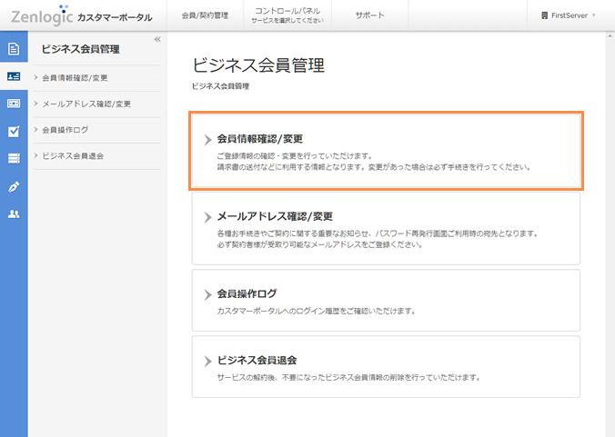 Zenlogicカスタマーポータルにログインし、「会員/契約管理」→「ビジネス会員管理」メニューを選択します。