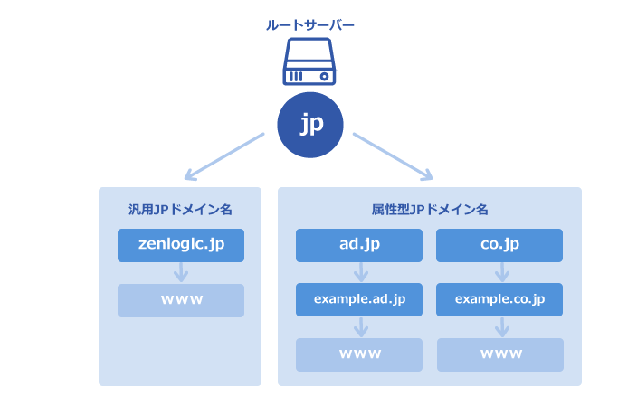 DNSサーバーは名前解決の処理を分散化させるために、ドメイン名を「.(ドット)」で区切ったレベルで階層構造になっています。それぞれのDNSサーバーは、自身の下位にあるDNSサーバーの情報を管理しています。
