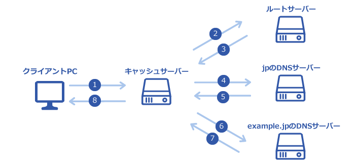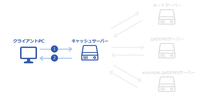 そこで、キャッシュサーバーと呼ばれる「DNSサーバーに問い合わせを行うためのサーバー」を用意し、クライアントからこのキャッシュサーバーを介して名前解決が行われています。