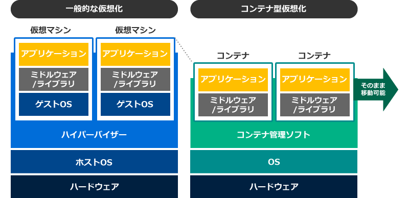 アプリケーションとその実行に必要なものがあらかじめコンテナ内にパッケージ化されていて、ミドルウェアやOSライブラリを個別に用意する必要がなく、どのような環境でもすぐに実行が可能です。