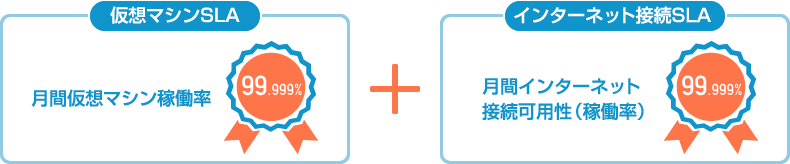 「IDCFクラウド」では「仮想マシン」と「インターネット接続」の2つのSLAを適用しており、国内クラウド事業者の中で最高水準の99.999%を保証しています。